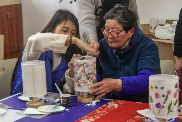 本次活动以压花台灯制作为主题,邀请专业教师进行现场讲解及示范。来自供应链管理学院的10余名学生志愿者与老人一对一结对,一步步协助老人完成压花。同学们和老人一边研究创作,一边交流探讨,活动现场洋溢着幸福的欢声笑语。构图、排列、裁剪……很快,一盏盏空白的台灯染上春日的色彩。花草与灯光融合,映照出一场光与影的浪漫。