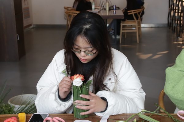 3月7日,国际商旅学院于丝路咖啡吧开展“美美与共,创意插花”活动。活动伊始,专业插花老师向同学们详细讲解了插花花材的识别、色彩的搭配、枝叶的剪裁等知识,并现场进行了插花展示。老师生动形象地将绿植形容成衣服,指导同学们完成“花边”制作,再将多头玫繁星、喷泉花、绿灵草、白色洋桔梗、白色小雏菊、尤加利细叶等花材按照自己的灵感依次插入花泥中,创作出属于自己的特别花束。在老师的精心指点下,一束束错落有致、生机盎然的插花作品展现在了大家眼前。插花完成后,同学们手捧鲜花,合影留念,正可谓花开在春天,人美在少年。