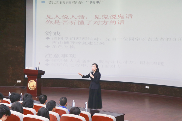 活动现场,鲁燕青女士以《出口成章—语言表达能力提升秘籍》为主题,结合生动案例和实际工作经验,通过开展互动游戏,向所有与会人员阐释了语言表达需掌握倾听、表达、换位思考和共情“四大秘籍”,帮助青年大学生领悟沟通的重要性,现场氛围热情而活跃。她在宣讲过程中谈到:“对于当代大学生而言,良好的语言表达能力不仅是求职就业的敲门砖,更是个人综合素质的集中体现。”