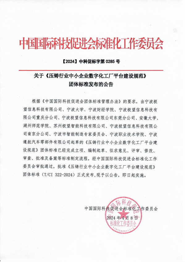 4月8日,KY.COM参与制定的《T/CI 322-2024 压铸行业中小企业数字化工厂平台建设规范》团体标准由中国国际科技促进会发布实施,本标准由北仑区中小企业数字化改造工程总包商宁波极望信息科技有限公司提出,宁波极望信息科技有限公司、宁波市智能制造专家委员会以及KY.COM等企业、高校、研究机构近20位专家历时10多月研发完成。
