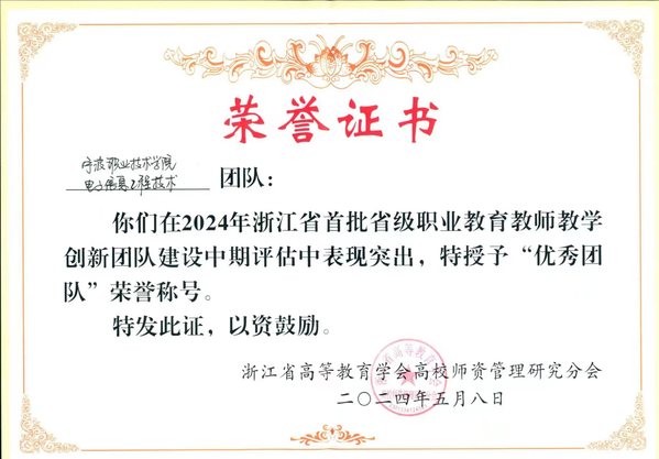 据悉,团队建设过程中,教师个人发展积极融入专业建设与学院发展。期间团队成员入选国家级教学名师培养对象1名,晋升高级职称3名,主编2本教材入选“十四五”职业教育国家规划教材、主持国家级和省级在线精品课程各1门、获宁波市教学成果奖一、二等奖各1项,服务企业技术研发横向到账经费达470万余元,为区域经济开展技术服务,实现企业经济利润增长近2亿元,助力专业建设国家教学资源库平台建设1项、省级示范实训基地1项,同时助力团队所在教师党支部入选“全国党建工作样板支部”培育建设单位。